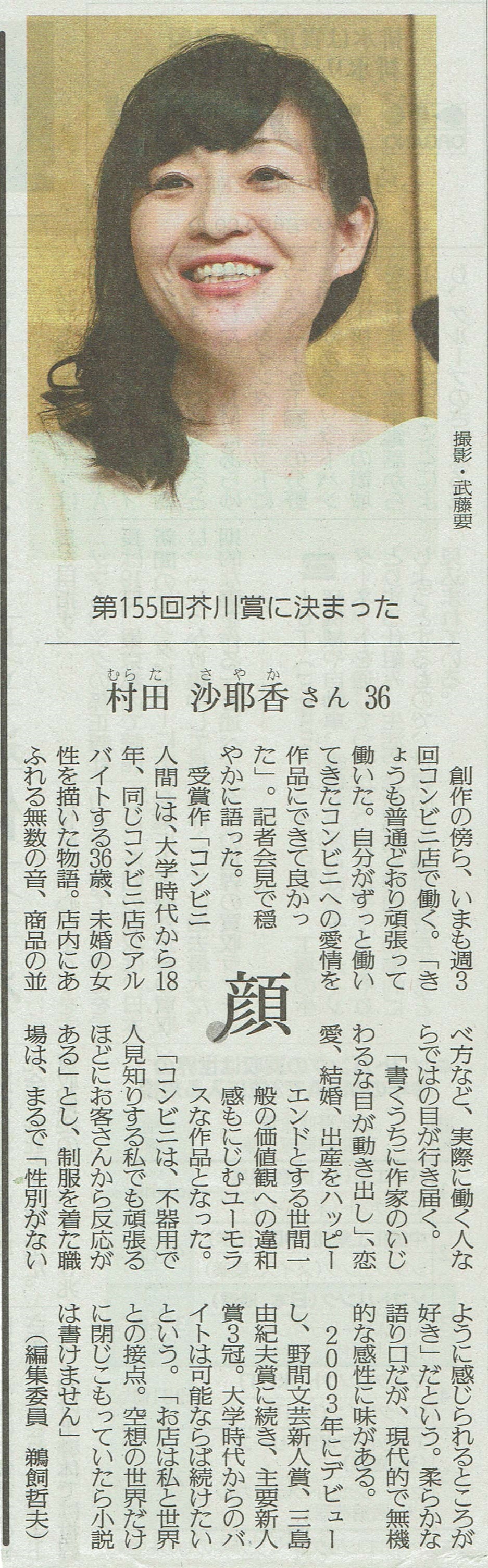 受賞作品のタイトルは、「コンビニ人間」。18年ずっと同じコンビニで働く36歳の未婚女性が主人公で、店内で働く様子を通じて『普通』という定義に対する批判をユーモアを交えながら表現されているそうです。